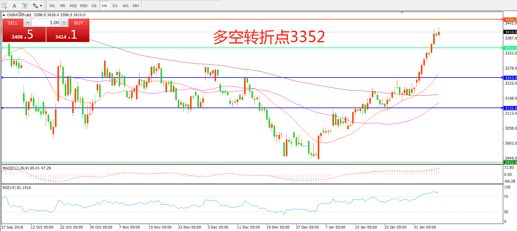 小时图看,CHINA300中华指数均线系统呈多头排列,整体走势十分强势。 MACD红柱增加,RSI拐头向上,维持偏多思路。