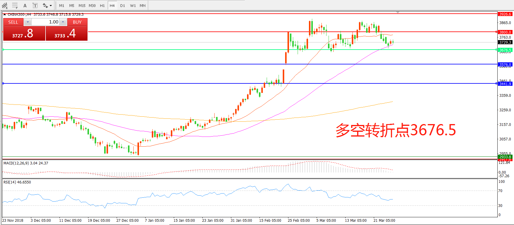 4小时图看,中华指数CHINA300高位盘整后出现大幅回落,整体走势陷入盘整,短期均线系统被跌破,55均线成为下一支撑, MACD红柱减少,RSI指标拐头向下,延续下行概率较大。