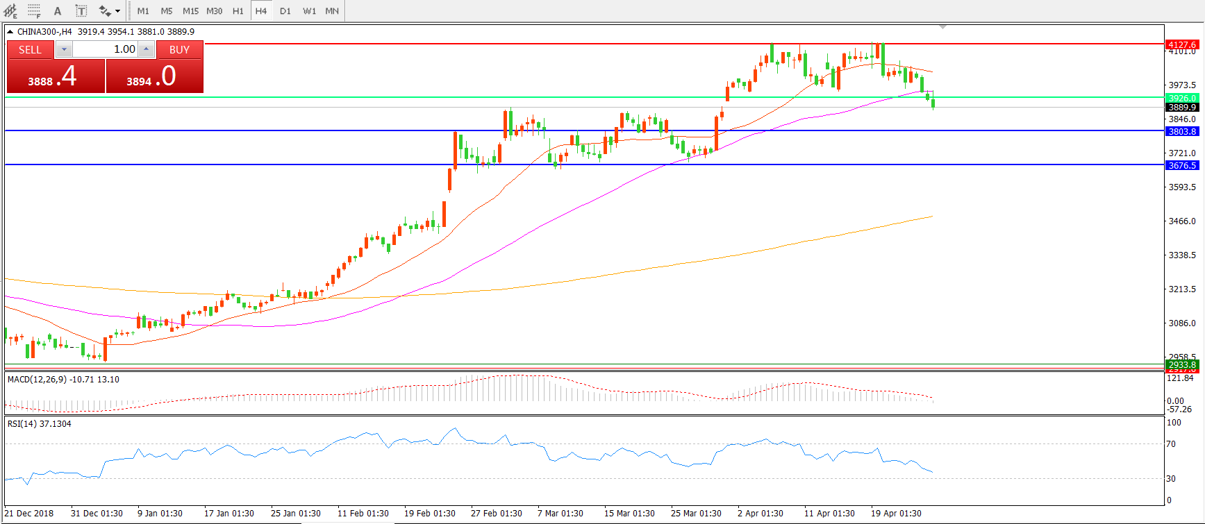 4小时图看,沪深300指数一路震荡下行,于55均线附近暂时企稳,MACD红柱减少,RSI指标向下,重点关注3926一线支撑力度。