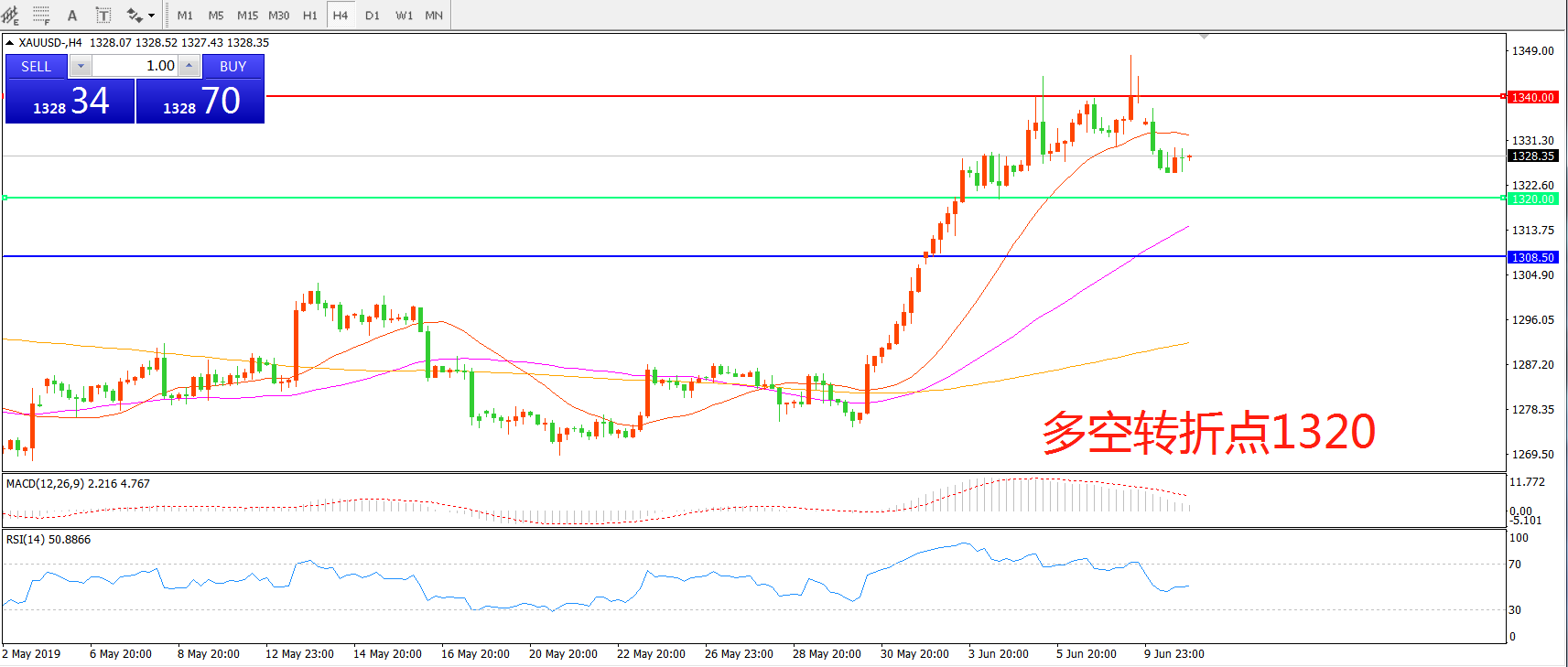 4小时图看,金价两次触碰1340阻力后回落,确认上方阻力有效,均短期均线走平,MACD红柱减少,RSI指标向上,短期以高位震荡思路对待,重点关注上方1340附近阻力。