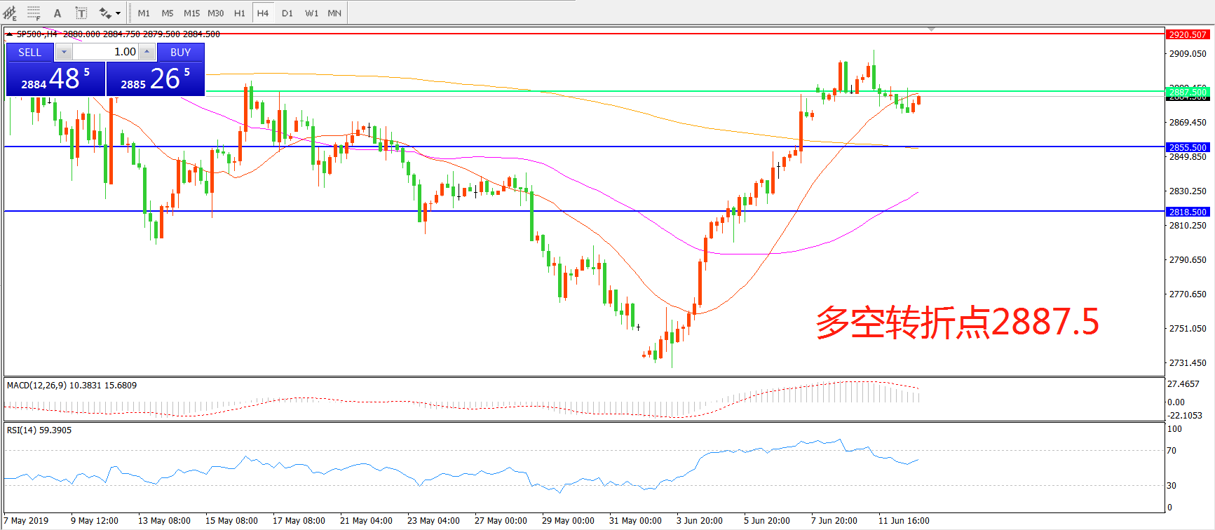 4小时图看,标普连续两日冲高回落,显示上方阻力较强, 2887.5成为短期争夺焦点,短期均线走平,MACD红柱减少,RSI指标走平,日内延续高位震荡思路概率较大。