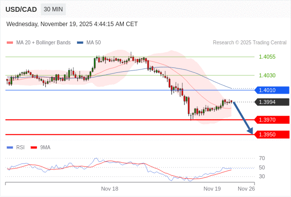 在 1.4010 之下,看跌,目标价位为 1.3970 ,然后为 1.3950 。