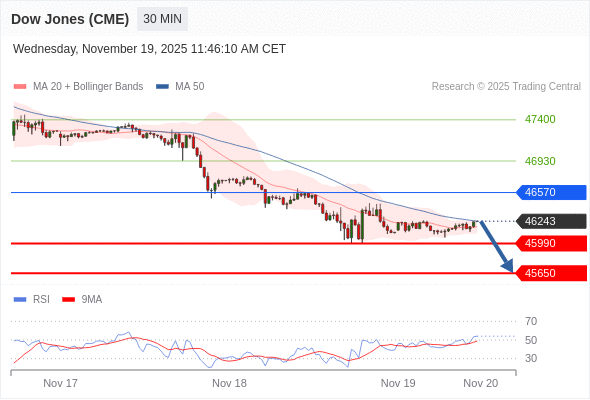 在 46570 之下,看跌,目标价位为 45990 ,然后为 45650 。