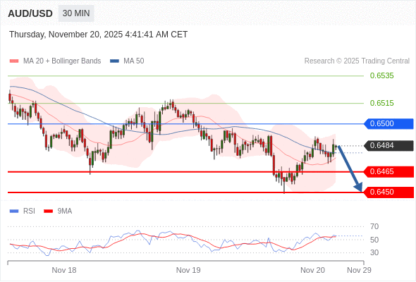 在 0.6500 之下,看跌,目标价位为 0.6465 ,然后为 0.6450 。