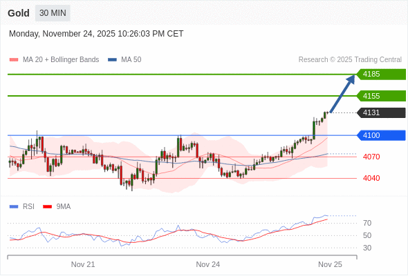在 4100 之上,看涨,目标价位为 4155 ,然后为 4185 。