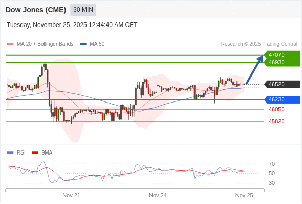 在 46230 之上,看涨,目标价位为 46930 ,然后为 47070 。