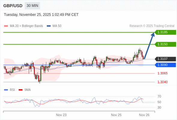 在 1.3090 之上,看涨,目标价位为 1.3150 ,然后为 1.3185 。