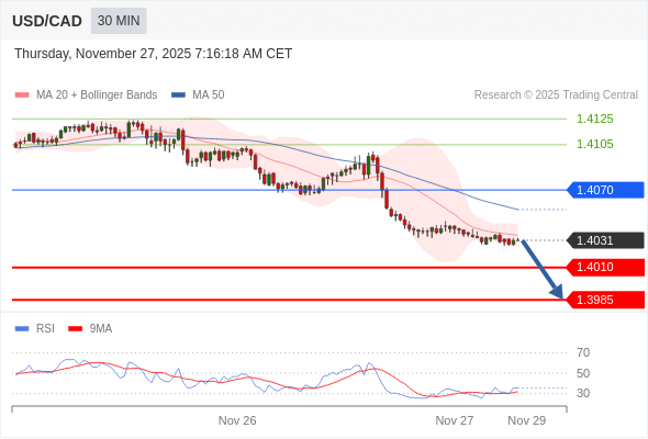 在 1.4070 之下,看跌,目标价位为 1.4010 ,然后为 1.3985 。