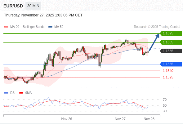 在 1.1555 之上,看涨,目标价位为 1.1605 ,然后为 1.1625 。