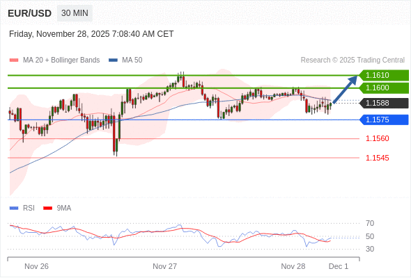 在 1.1575 之上,看涨,目标价位为 1.1600 ,然后为 1.1610 。