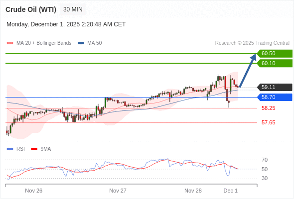 在 58.70 之上,看涨,目标价位为 60.10 ,然后为 60.50 。