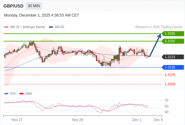 在 1.3195 之上,看涨,目标价位为 1.3265 ,然后为 1.3285 。