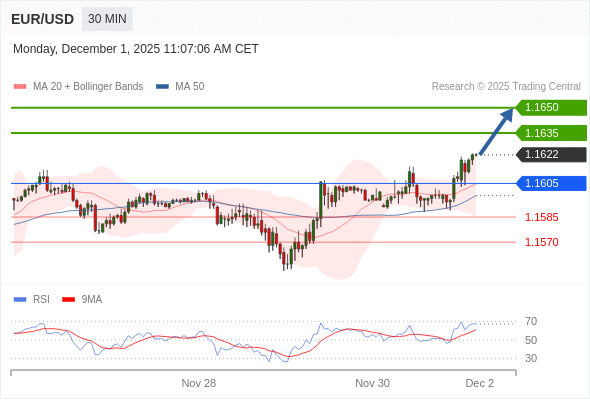 在 1.1605 之上,看涨,目标价位为 1.1635 ,然后为 1.1650 。