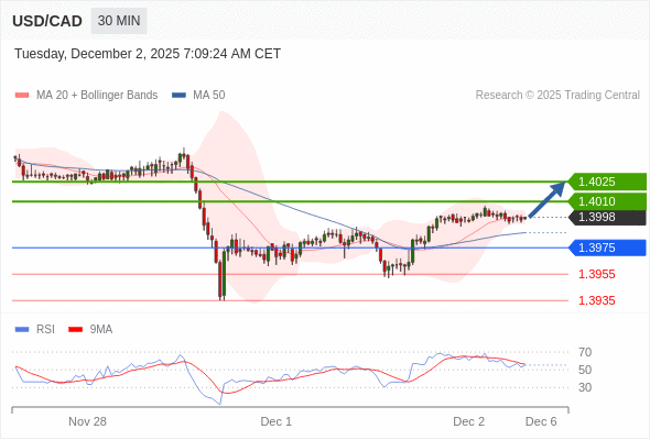 在 1.3975 之上,看涨,目标价位为 1.4010 ,然后为 1.4025 。