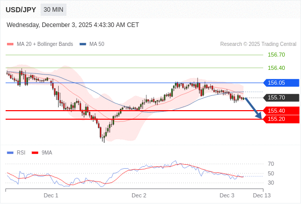 在 156.05 之下,看跌,目标价位为 155.40 ,然后为 155.20 。
