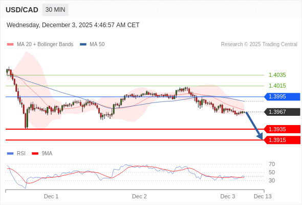 在 1.3995 之下,看跌,目标价位为 1.3935 ,然后为 1.3915 。