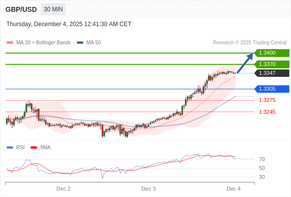 在 1.3305 之上,看涨,目标价位为 1.3370 ,然后为 1.3400 。