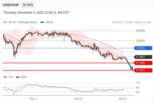在 0.8015 之下,看跌,目标价位为 0.7985 ,然后为 0.7970 。