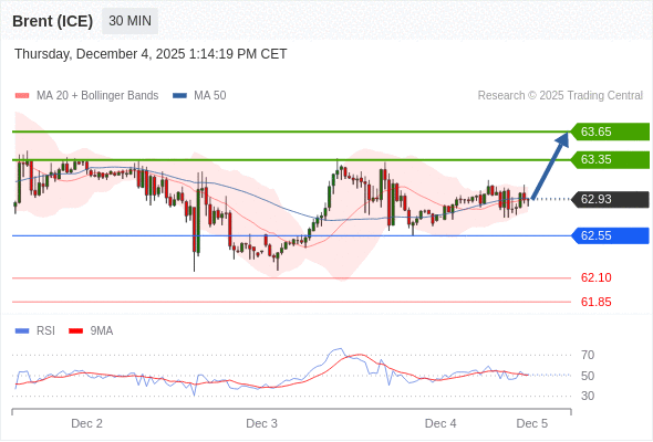 在 62.55 之上,看涨,目标价位为 63.35 ,然后为 63.65 。