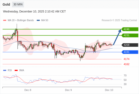 在 4191 之上,看涨,目标价位为 4231 ,然后为 4246 。