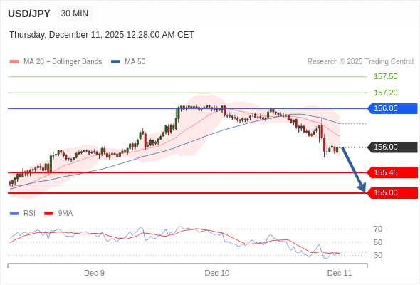 在 156.85 之下,看跌,目标价位为 155.45 ,然后为 155.00 。