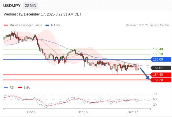 交易策略: 在 155.00 之下,看跌,目标价位为 154.40 ,然后为 154.20 。