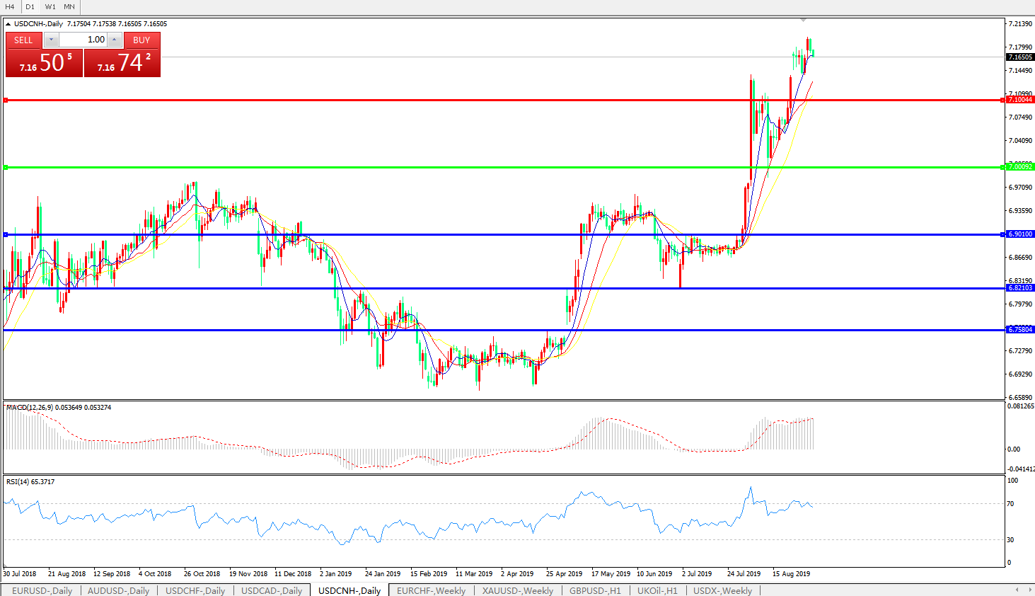 技术面简析:日图均线呈有序多头排列,汇价连续上攻后有回踩整理迹象,MACD运行在0轴上方且动能有再度放量迹象,RSI自超买区域下行,预计短期汇价存回落整理需求,重点关注7.20-7.30区间的压制;中美贸易战后续进展决定汇价中期走势。