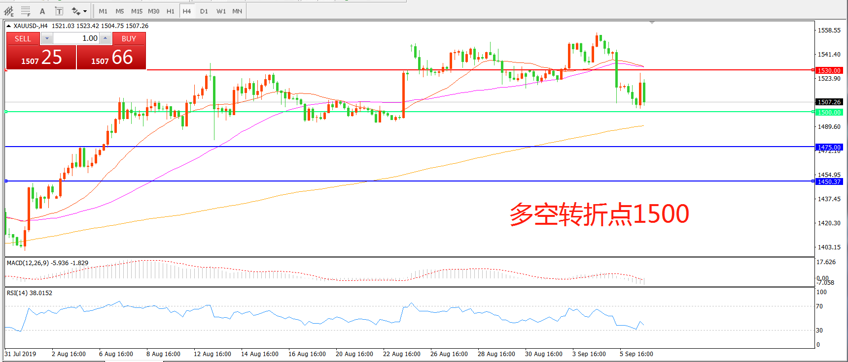 周四(9月6日),根据美国劳工部公布的数据,美国8月非农就业人口增加13万,为2019年5月以来低位,不及市场预期,现货金价自低位一度回升,随后美联储主席鲍威尔发表讲话,他在话中表示,就业报告证实了美国劳动力市场继续维持稳健;美国经济前景仍然乐观,尽管存在贸易不确定性,但他没有预见或预期美国经济会陷入衰退。鲍威尔的乐观发言对金价形成了打压,最终现货黄金震荡下行,收于1507.26美元/盎司。