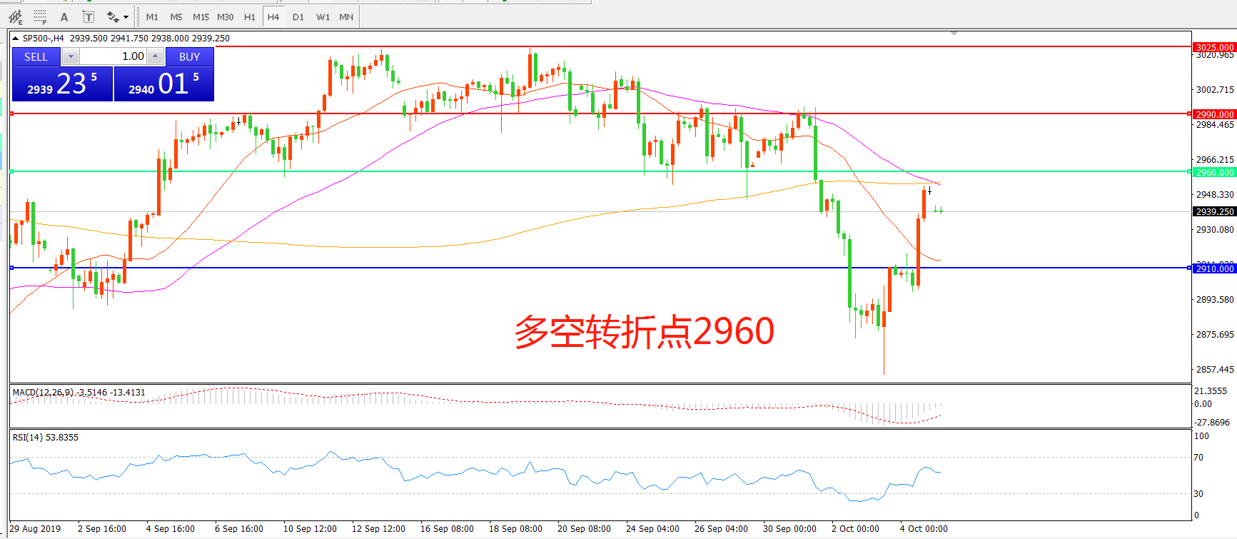 4小时图看,标普500探底回升,前期跌幅基本被收复,2960再次成为关注焦点,均线系统拐头向下,MACD绿柱缩短,RSI指标拐头走平,日内延续震荡较大。