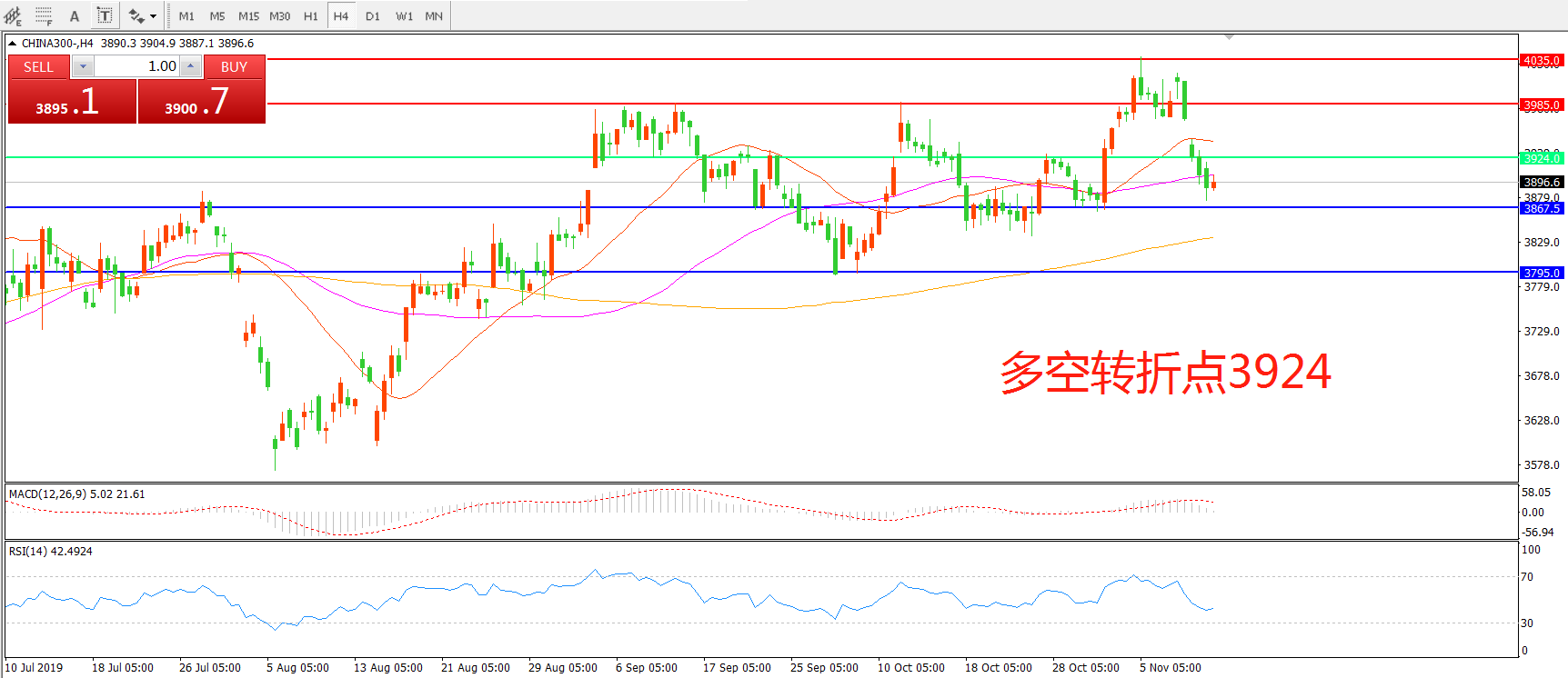 4小时图看,沪深300延续低位震荡,整体走势偏弱,3867.5成为短期支撑,均线系统走平,MACD红柱减少,RSI指标向下,日内延续下行概率较大。