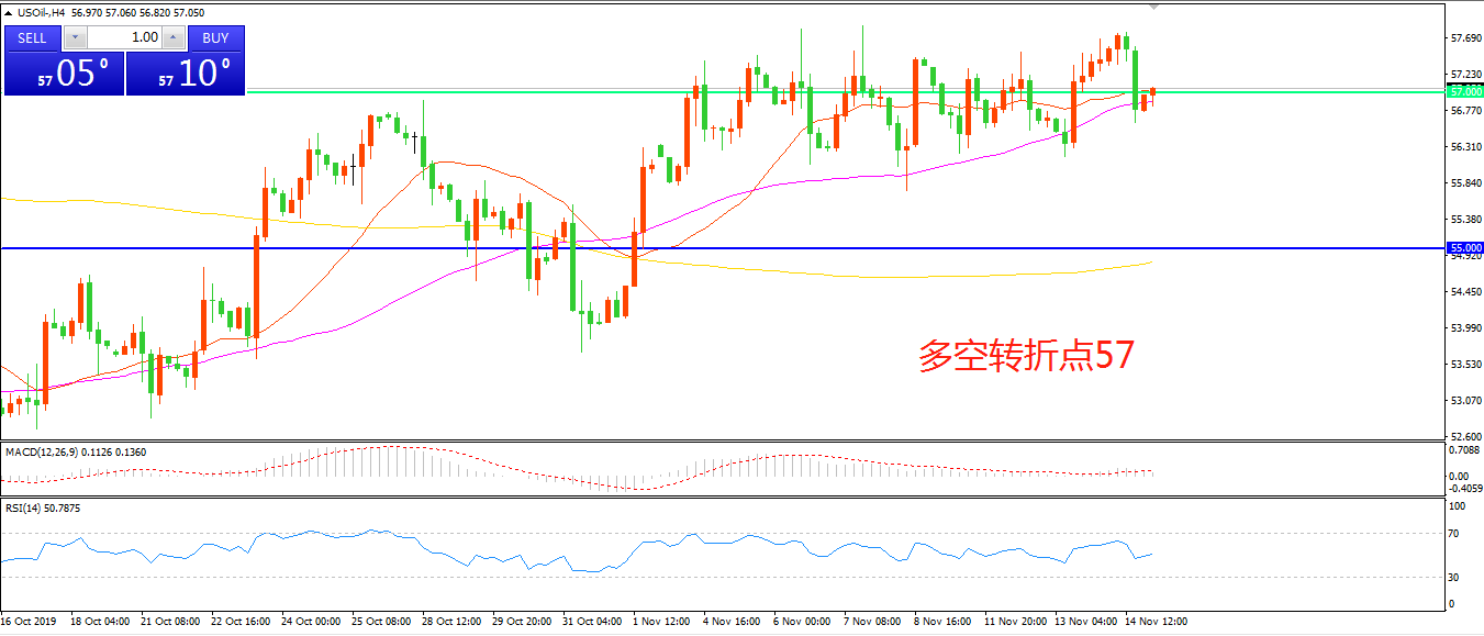 4小时图看,油价以200周期均线为依托强势反弹,前期跌幅基本被收复,整体表现有所回暖,57美金成为短期多空分水岭,均线系统走平,MACD绿柱缩短,RSI指标走平,如能站稳57美金一线,有进一步上行可能。