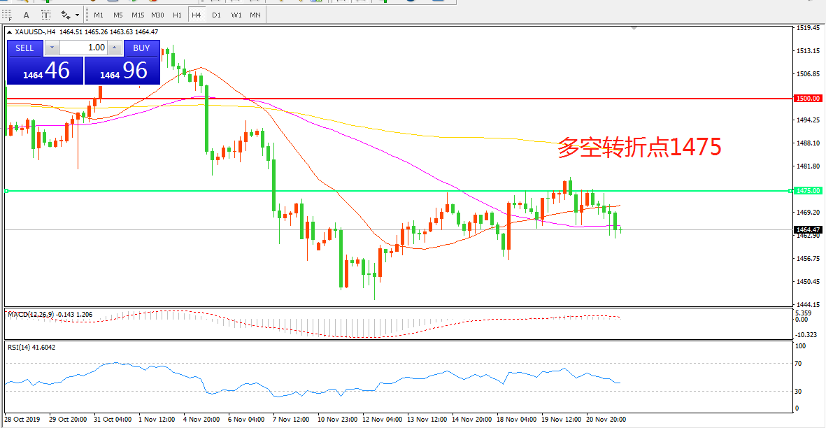 周四(11月21日)中国商务部新闻发言人高峰表示,中美双方经贸团队将继续保持密切沟通,关于协议磋商的细节,外界的传言并不准确。商务部的发言安抚了市场情绪,避险情绪回落导致金价下行,收报1464.49美元/盎司。在美联储观望且本周经济数据稀少的背景下,两大国贸易谈判引发了全球市场投资者的关注,而这其中利多和利空传言消息此起彼伏,反反复复,引发了黄金市场短线剧烈波动,接下来市场还需要关注全球经济前景、地缘局势变化、美联储政策前景、英国脱欧等方面的消息。