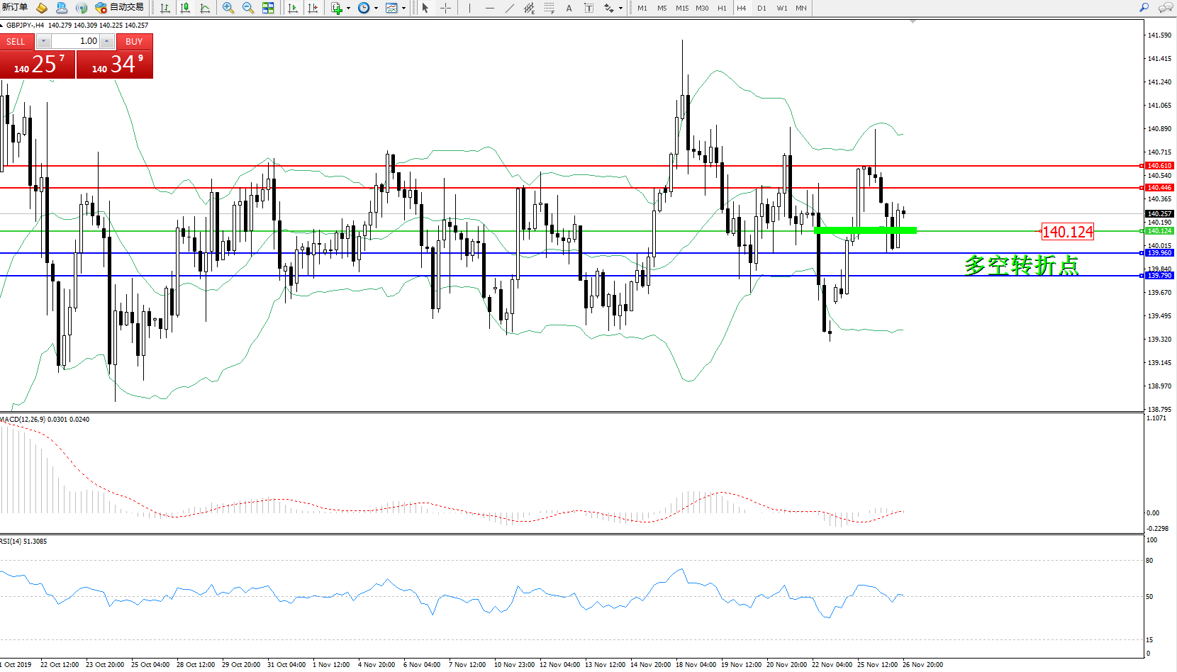 备选策略:140.124下方看跌,目标139.960、139.790
