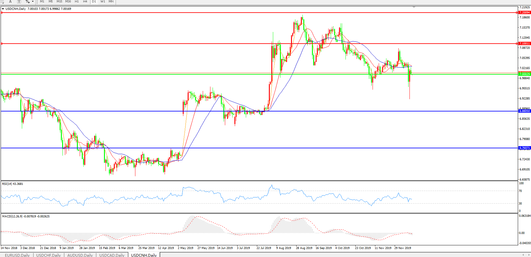 交易策略: 在7.0000之下,看跌,目标价位为6.8805,然后为6.7600。