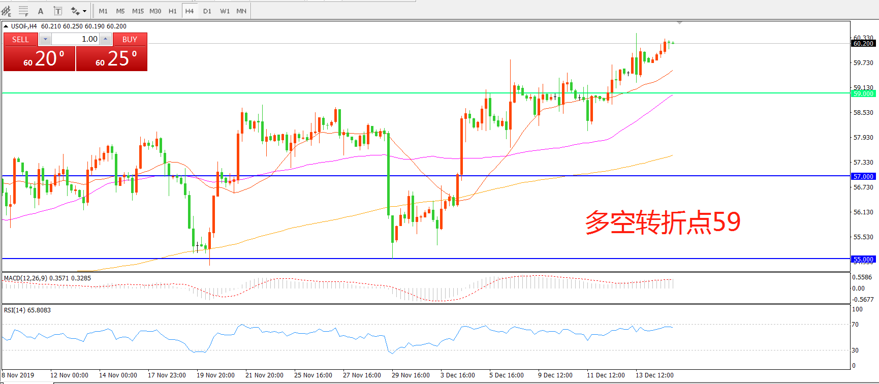 4小时图看,油价连续反弹,整体走势偏强,59美元被突破后,有加速上行的趋势,均线系统呈多头排列,MACD红柱增加,RSI指标走平,日内延续上行概率较大。