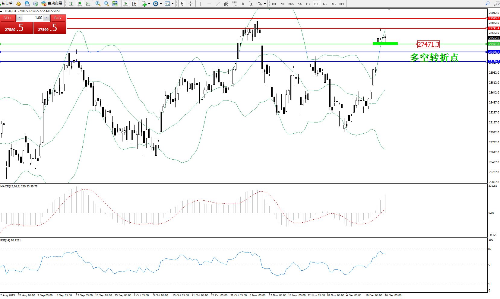 香港恒生指数12月16日(周一)收盘下跌179.67点,跌幅0.65%,报27508.09点;外围好消息带动港股上周五急升693点,恒指更以是日高位27687收市。成交金额更超越千亿至1,173亿元。月初悲观时曾跌26000,低见25995,但仅7日,巳见急速反弹1692点。市场最关注的两大事件终于有了新的突破:中美第一阶段经贸协议文本达成一致和英国大选保守党获胜。两者均对股市形成利好,提振市场风险投资情绪。