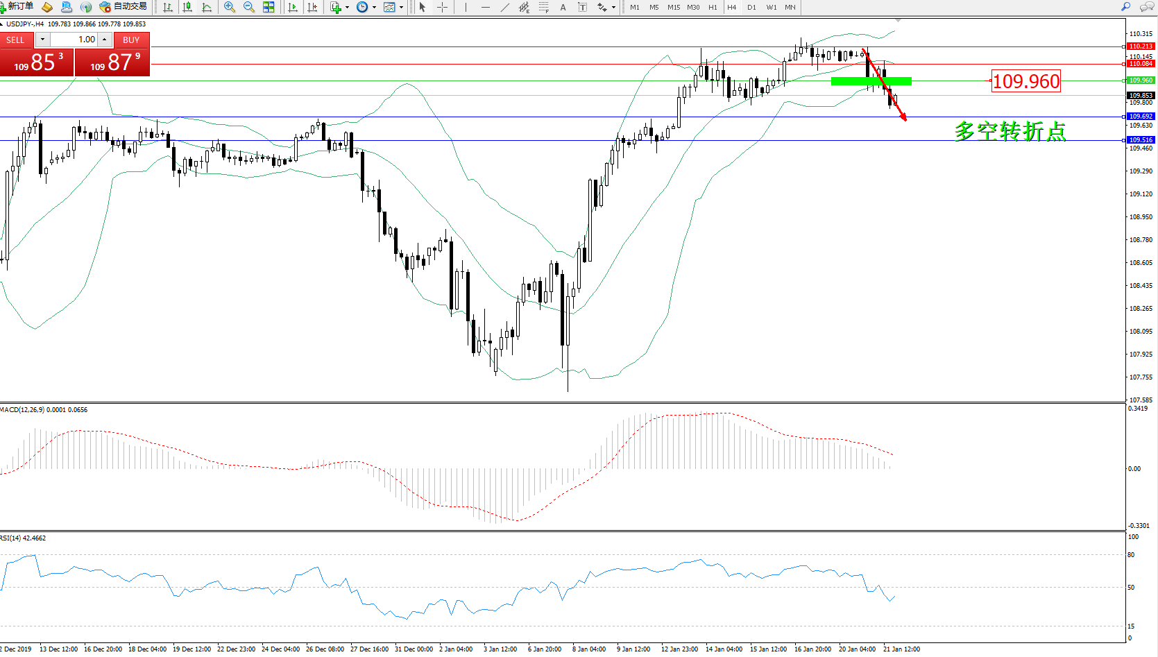 美元兑日元在周二(1月21日)亚洲时段早盘录得快速跳跌,此后继续延续颓势,跌至109.89这一上周四以来的新低。日内亚洲股市普遍出现大幅下挫,此状况挫伤了全球投资者的风险偏好情绪,令避险货币日元受到热捧; 而日本央行行长黑田东彦此后发布了基调消极的措辞,也令投资者风险偏好情绪进一步受挫。上周,受中美一阶段贸易协议达成带来的持续乐观情绪影响,亚洲金融市场情绪曾普遍乐观。但眼下,对区域及全球经济前景的顾虑重新升温,却令避险再度成为投资者交易行动的首选。此外,在农历新年来临在即之时,亚洲投资者的操作方向也趋于保守; 日内的跌势也令美元兑日元短线强势的趋势进一步受挫,下方关键支撑下看上周三低位109.79,跌破后将下探109.45一线,届时将确认短线头部形态,反之,若汇价日收盘仍重新升至5日均线110.07上方,则说明多头力度仍然强劲,后市仍有续涨动能