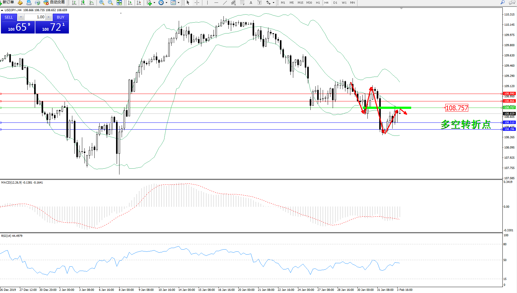 交易策略:108.757下方看跌,目标108.510、108.396