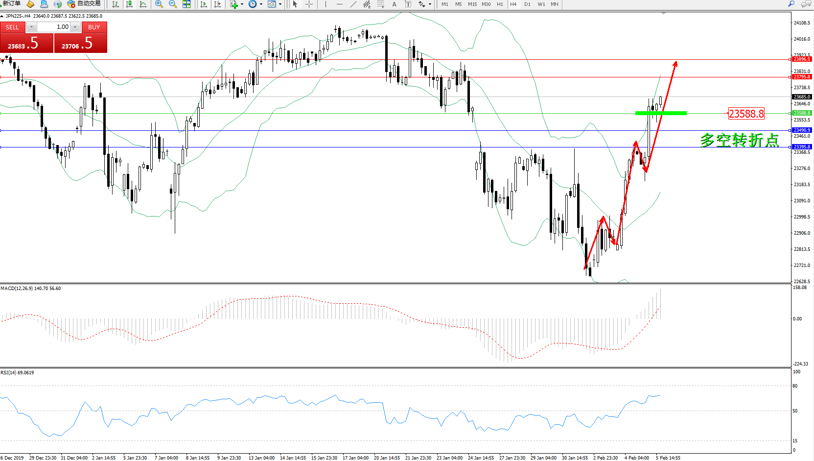 日经225指数2月5日(周三)收盘上涨348.06点,涨幅1.52%,报23320.00点。日本央行副行长若田部昌澄称:日本央行将密切评估经济和物价情况,以研判达成物价目标的机制是否奏效;鉴于当前经济情势,有必要留意经济下行风险成真,并影响物价;如果达成物价目标的机制无效,将毫不犹豫采取额外宽松举措,若通胀未达日央行目标,日本不排除有可能重回通缩,日本央行预期全球经济增长将逐步回升,如果制造业活动持续放缓,将可能逐步影响非制造业及家庭,日本经济可能大幅放缓,但放缓可能是暂时的。