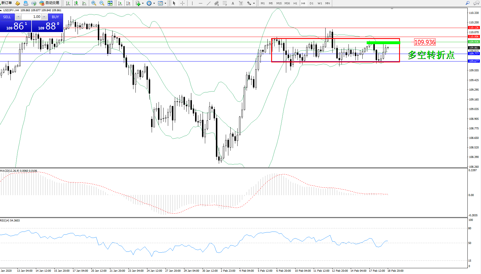 备选策略:109.936上方看涨,目标110.006、110.126