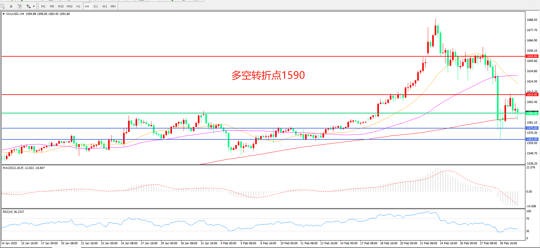 4小时图看,金价长阴下破,以200周期均线为依托成展开整理, MACD绿柱增加,RSI指标走平,如能收复1590一线,金价有望止跌反弹。