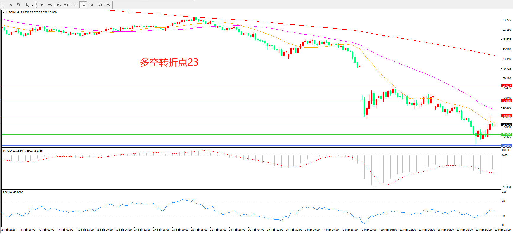 4小时图看,美油以23美元为支撑小幅反弹,整体有止跌迹象,但均线系统仍呈空头排列,MACD绿柱缩短,RSI指标走平,日内延续震荡概率较大。