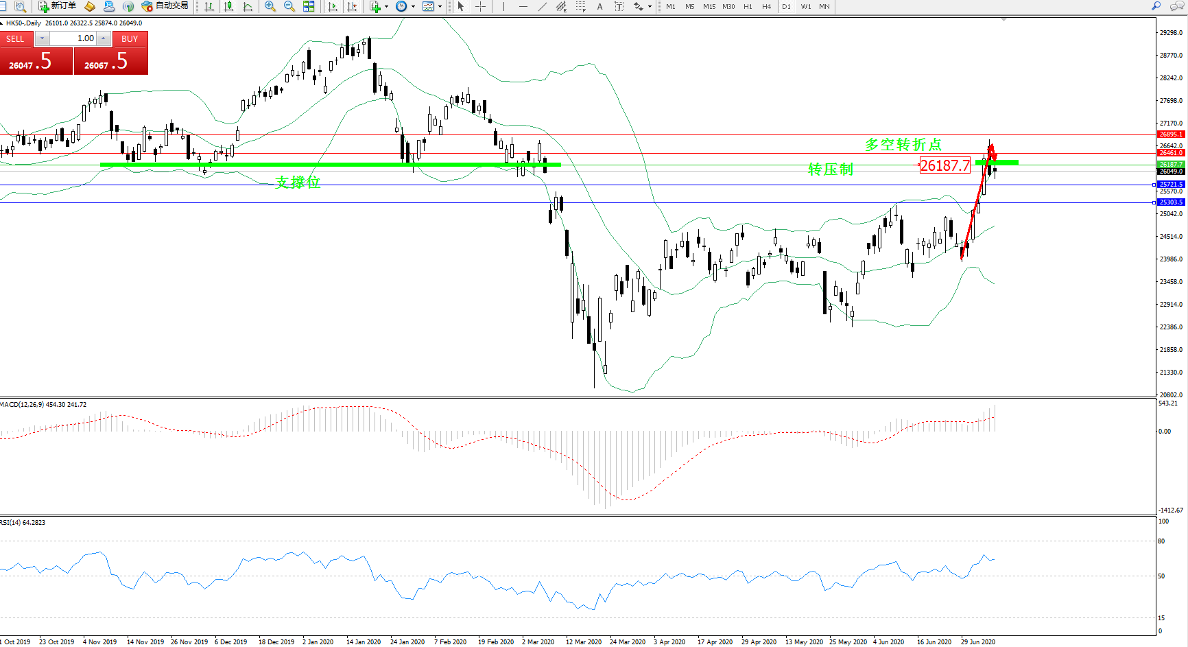 香港恒生指数7月8日(周三)收盘上涨153.52点,涨幅0.59%,报26129.18点;港股三大指数均收涨,恒指盘中震荡加剧,南下资金大幅流入103.25亿港元,大市成交额为1961亿港元。军工股崛起领涨,中船防务暴涨超55%;中资券商股、半导体再度强势,光大证券大涨近12%,在线教育股均走强;腾讯大涨5.23%,市值约5.19万亿超越阿里成为中国第一市值公司。美团点评(3690.HK)收于历史最高价,市值1.16万亿升至港股第7位.A股的强势已经按耐不住,三大指数已经全面实现了反包,领头的创业板更是气势如虹。而港股的走势相对温和,因为外围的不利因素对港股构成制约,但在A股的强势带动之下,负面的影响力只会愈来愈小。目前指数已经不太重要,重要的是市场氛围,热点的全面活跃才是关键,核心资产继续受到踏空资金的青睐才是重点。