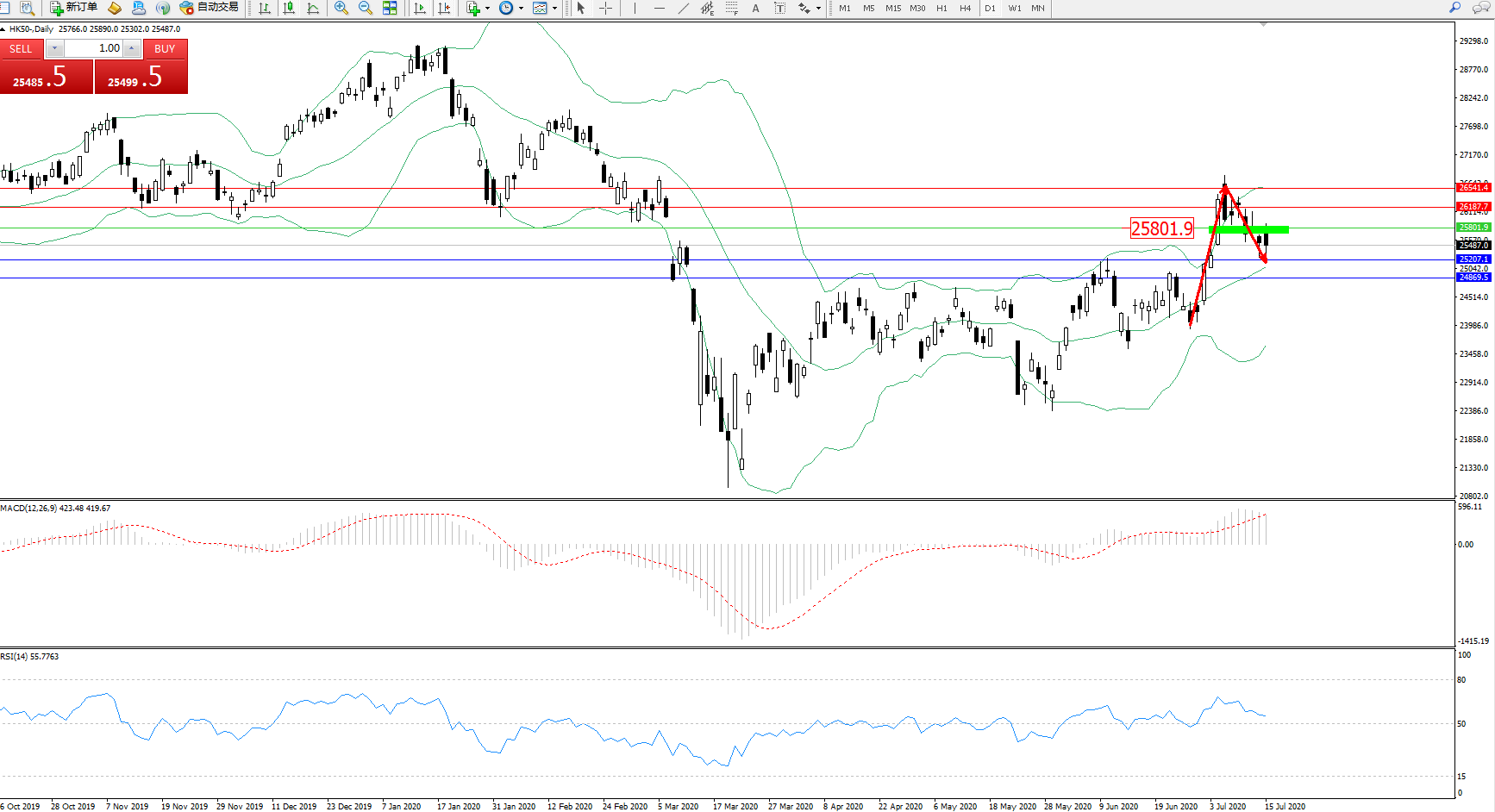 技术点评:多头动力强势拉升上扬后遇阻回撤,高位空头动力强劲,即将触及布林带指标中轨附近节点,且有继续回撤态势,布林带指标呈张口走势后开始有收口迹象,MACD指标处于0轴线上方多头区域高位持续整理平移中,RSI指标处于多头区域高位弱势震荡开始回撤下移中;