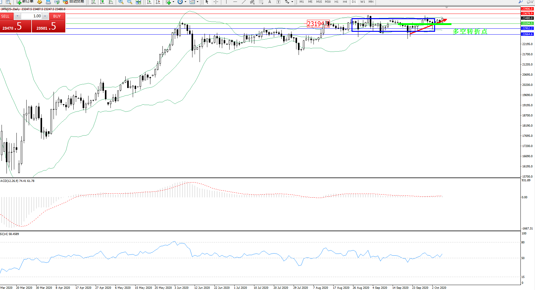 日经225指数10月7日(周三)收盘下跌19.23点,跌幅0.08%,报23414.50点。尽管美国新一轮的新冠刺激计划将被搁置,但市场目前的焦点依旧在美国大选和疫情层面,日本政府表示,同步指标指数显示经济停止下滑。投资者在评估刺激方案的进展和众议院一个委员会关于反托拉斯法改革以遏制美国科技巨头力量的提案,美股指数期货上下震荡。 美国总统特朗普呼吁支持航空公司和薪资保护计划,股市收复一些失土。隔夜美国总统特朗普在社交媒体上表示,他已经拒绝了民主党提出的2.4万亿美元财政刺激方案,并命令他的代表停止谈判,直到美国总统大选结束。这一消息彻底瓦解了市场对两党近期达成财政刺激方案的憧憬,美股三大股指全部由涨转跌。