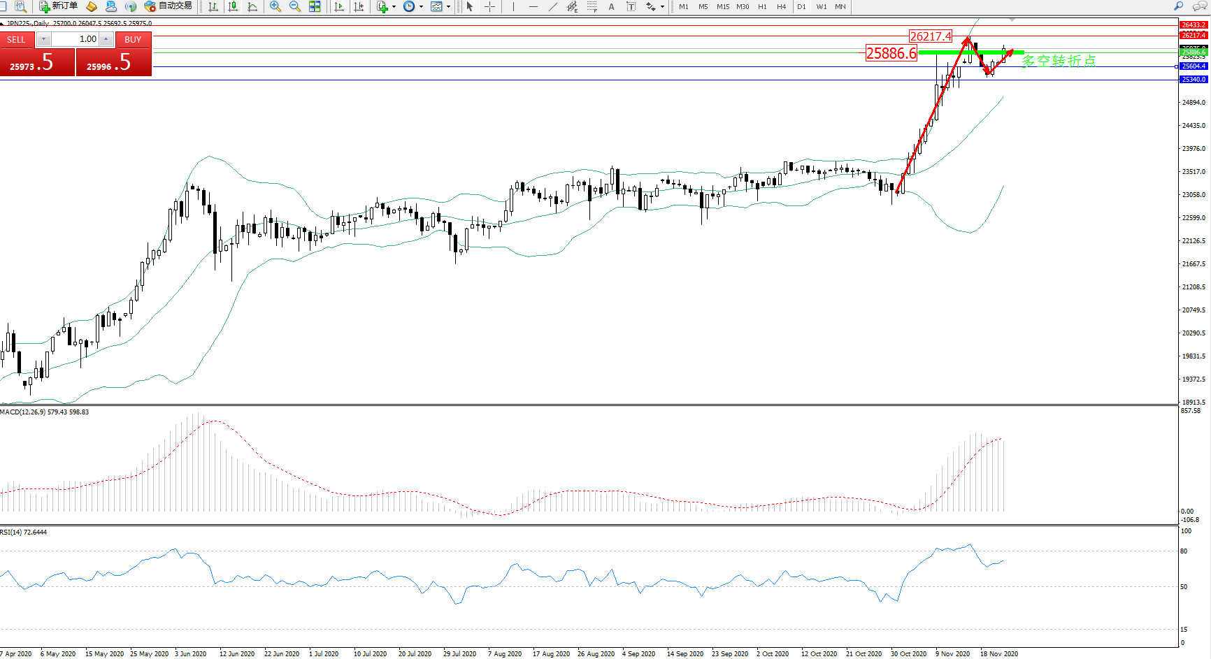 日经225指数11月20日(周五)收盘下跌109.34点,跌幅0.43%,报25525.00点。美国、日本和欧洲多国的新冠病毒日感染人数增幅都创下纪录新高,投资者恐慌情绪仍未消退,而与此同时,美联储和美国财政部在资金使用方面出现的新的争端,又让之一美国国会两党好不容易才开始重新接洽谈判所带来的利多直接灰飞云散,美国恢复谈判的前景对于市场风险情绪暂时略有支撑,但其前途仍然坎坷,再叠加上美国选情与欧盟财政援助协议的纠结,连同全球疫情的加速爆发。日本首相菅义伟:应该对疫情保持高度警惕。将迅速推进医疗准备工作。将继续与国际奥委会一起为奥运会做准备。日本财务大臣麻生太郎:财务省和日本央行在金融稳定方面合作良好。必须用财政政策刺激市场情绪。有一些公司和行业因疫情而发展壮大。正考虑对能提高生产率的资本支出予以支持。