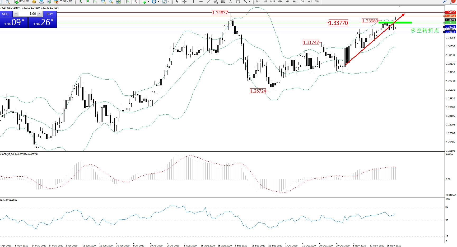 交易策略:1.33770上方看涨,目标1.34454、1.34837