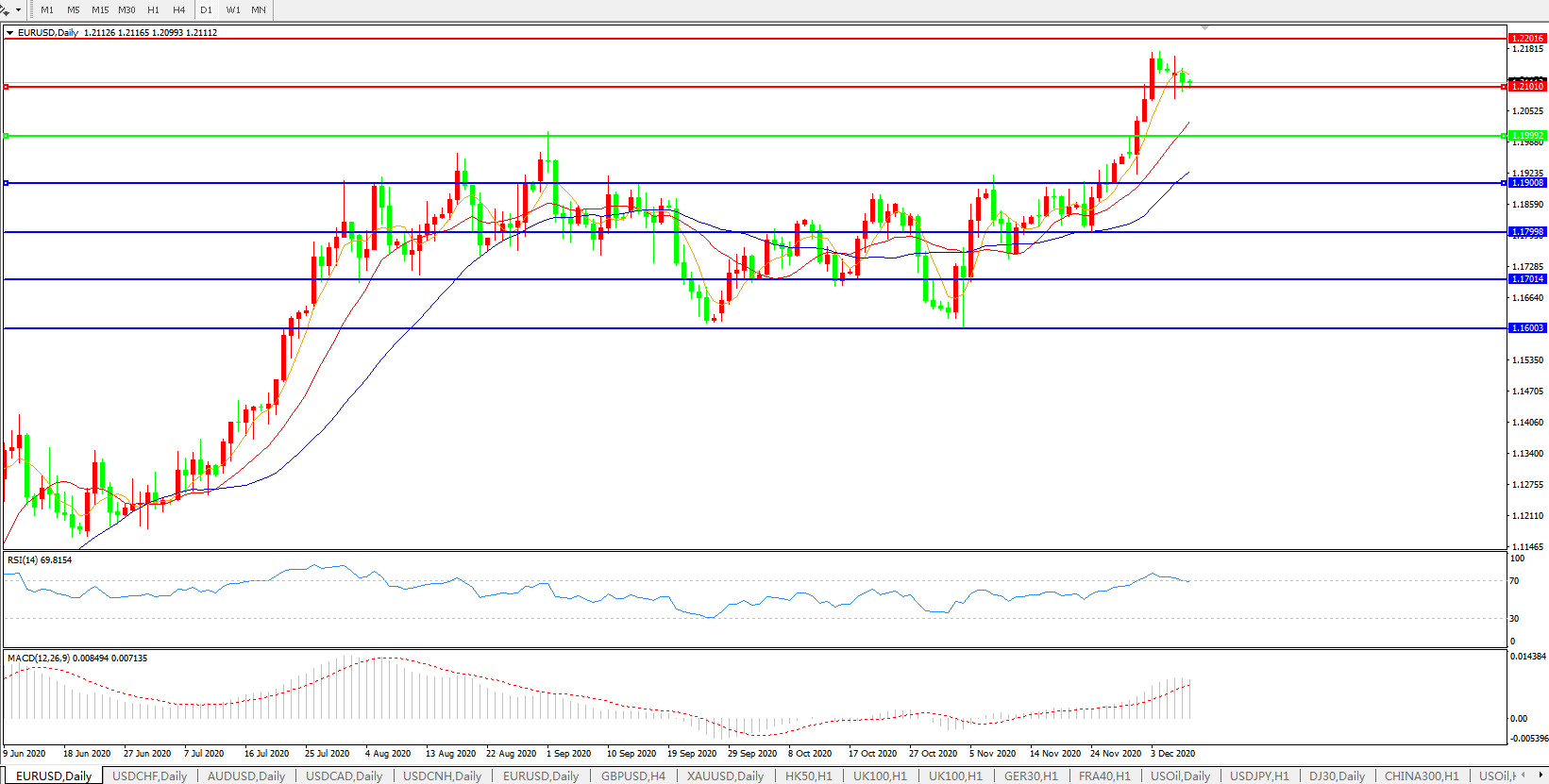 欧元兑美元在上周创出两年半新高后,本周陷入高位盘整蓄势走势,汇价在与英国脱欧关联的利多与利空消息交替冲击下持续陷入震荡,同时欧洲央行本周政策决议在即的前景也令投资者不再单边押注做多,但于此同时,对手盘美元走势的持续疲弱却也令欧元汇价缺少进一步回调的空间; 在此种状况下,虽然欧洲央行本周强化宽松的预期确实有所发酵,但市场却念及美联储在下周一定会跟进行动这一点状况,而并未强力做空欧元,于是隔夜以来欧元兑美元仍守于1.21上方的相对高位,这确保了其整体上行趋势仍然巩固。在1.21下方,本周一的低位1.2079仍是强支撑,失守后汇价可能进入短线头部构筑形态,进一步的确认支撑位在10日均线切入位1.2058。