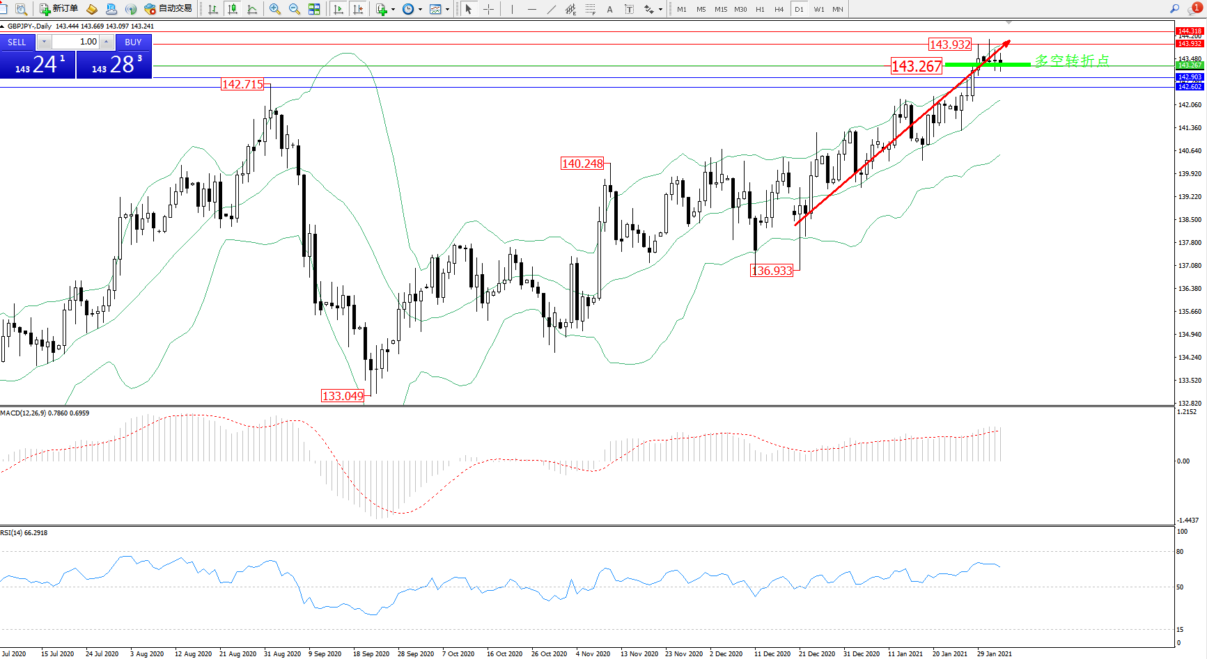 备选策略:143.267上方看涨,目标143.932、144.318