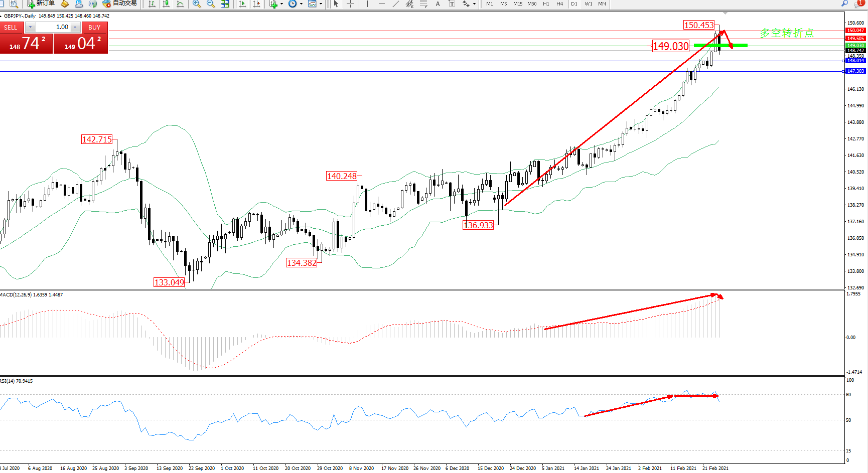 技术点评:多头动力延续布林带指标通道上轨附近持续震荡上扬态势良好,高位抵达150.453附近节点后短暂遇阻回撤,关注上轨内侧附近节点,布林带指标呈缓慢上移张口走势持续中,MACD指标处于多头区域平缓上扬走势,RSI指标处于超买区80均衡线附近整理有回撤下移迹象;